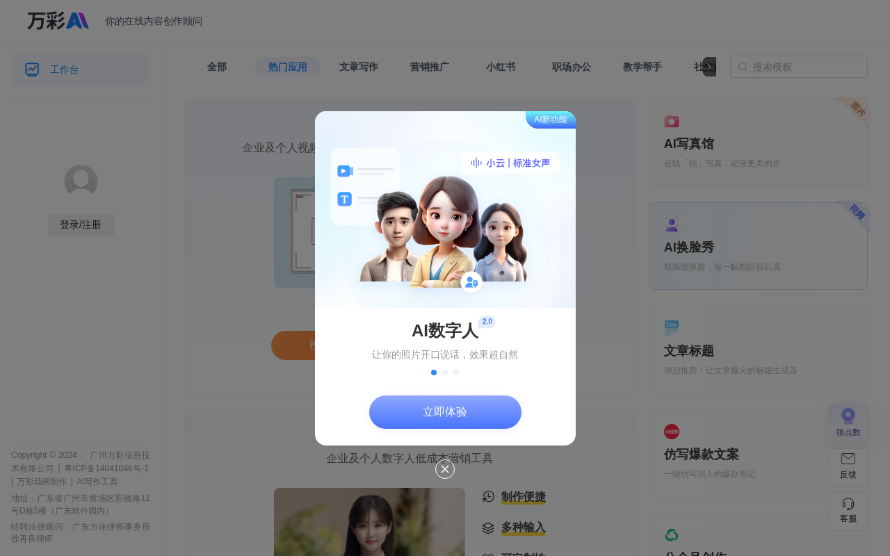万彩AI是一个综合性的AI创作平台,旨在通过人工智能技术简化视频制作、内容创作和数字人生成等流程,帮助用户快速生成高质量的创意内容。该平台无需用户下载软件,所有功能均在线操作,适合内容创作者、教育工作者、电商从业者、营销人员以及对AI技术感兴趣的个人或企业使用。