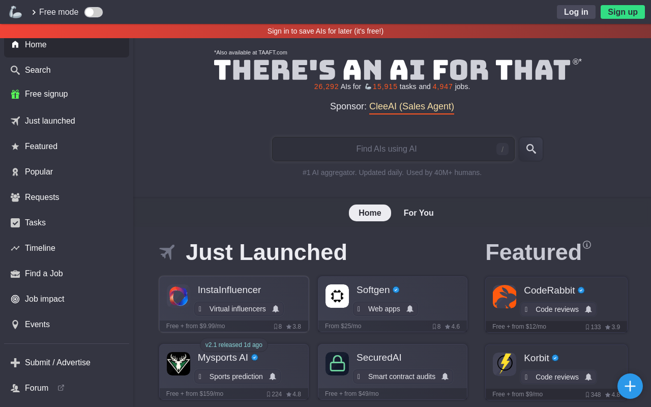 总的来说,“There’s An AI For That”是个资源非常丰富的AI工具库。它不只是个目录,更像一个连接工具、开发者和用户的枢纽。如果你需要AI帮忙,或者单纯对AI工具好奇,把它加入书签准没错。