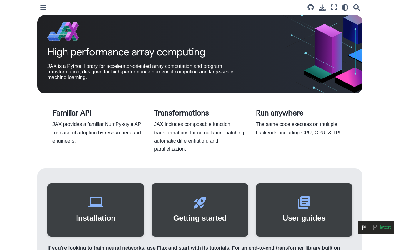 JAX 的目标是提供高性能、易扩展的计算框架,支持从快速原型设计到大规模生产部署,广泛应用于 Google 内部项目(如 AlphaFold、PaLM)和学术研究。文档涵盖安装、核心功能、进阶用法和生态系统工具(如 Flax、Optax),适合机器学习工程师、研究员和数据科学家。