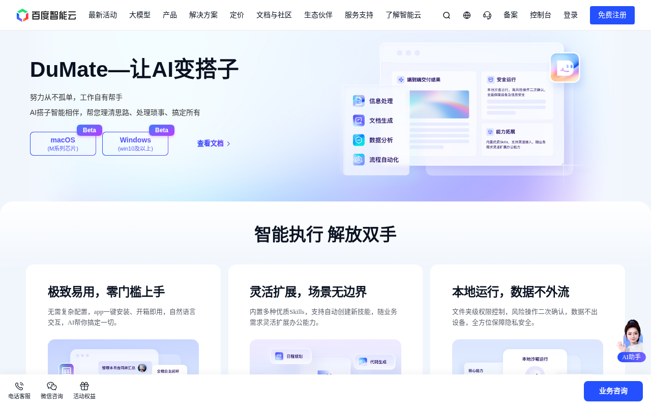 DuMate是百度智能云推出的桌面端AI办公智能体,定位为AI工作搭子,主打本地运行、智能执行、安全可控,面向个人与企业提供一站式办公自动化能力,是国内首个企业级满血版OpenClaw(龙虾) 产品。