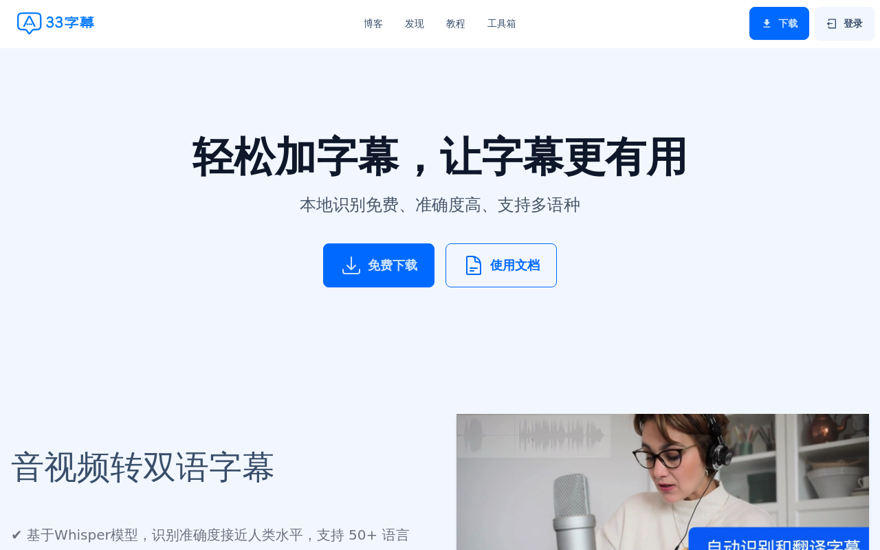 33字幕是一款基于AI技术的智能双语字幕工具,专注于为视频、音频内容提供高效的语音识别、字幕生成及翻译服务