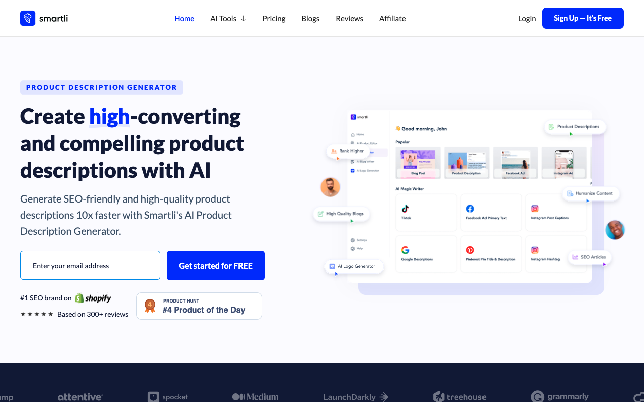 Smartli.aihttps://www.smartli.ai/)是一个AI驱动的内容和图像生成平台,主要针对电商和创业者,提供一站式工具来自动化生成产品描述、博客文章、广告文案和图像编辑,帮助用户快速创建高质量营销材料,提升销售转化。该平台强调无需技术技能、秒级生成和SEO优化,已服务超过50万名用户,支持Shopify集成,适用于电商内容创作和视觉优化。