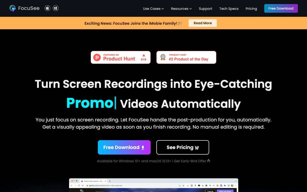 FocuSee(通过 https://gemoo.com/focusee 访问)是由 Gemoo 开发的一款创新型屏幕录制和视频编辑软件,旨在通过人工智能(AI)自动化技术简化视频后期的制作流程,帮助用户快速将屏幕录制转化为专业、引人入胜的视频内容。该平台特别适合非专业用户,如营销人员、内容创作者、教育工作者和企业用户,用于制作教程、演示、促销、产品发布或销售视频。FocuSee 的核心特点是自动添加动态平移和缩放效果、背景美化以及其他视觉增强功能,无需手动编辑即可生成高质量视频。