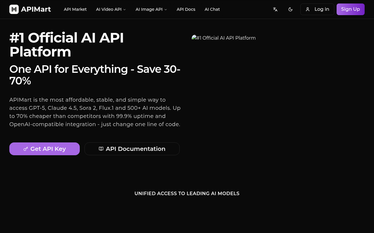 APIMart 是一个统一的 AI API 平台,核心是通过单一接口提供 500+ 主流 AI 模型的访问权限,兼具低成本、高兼容性和高可靠性。