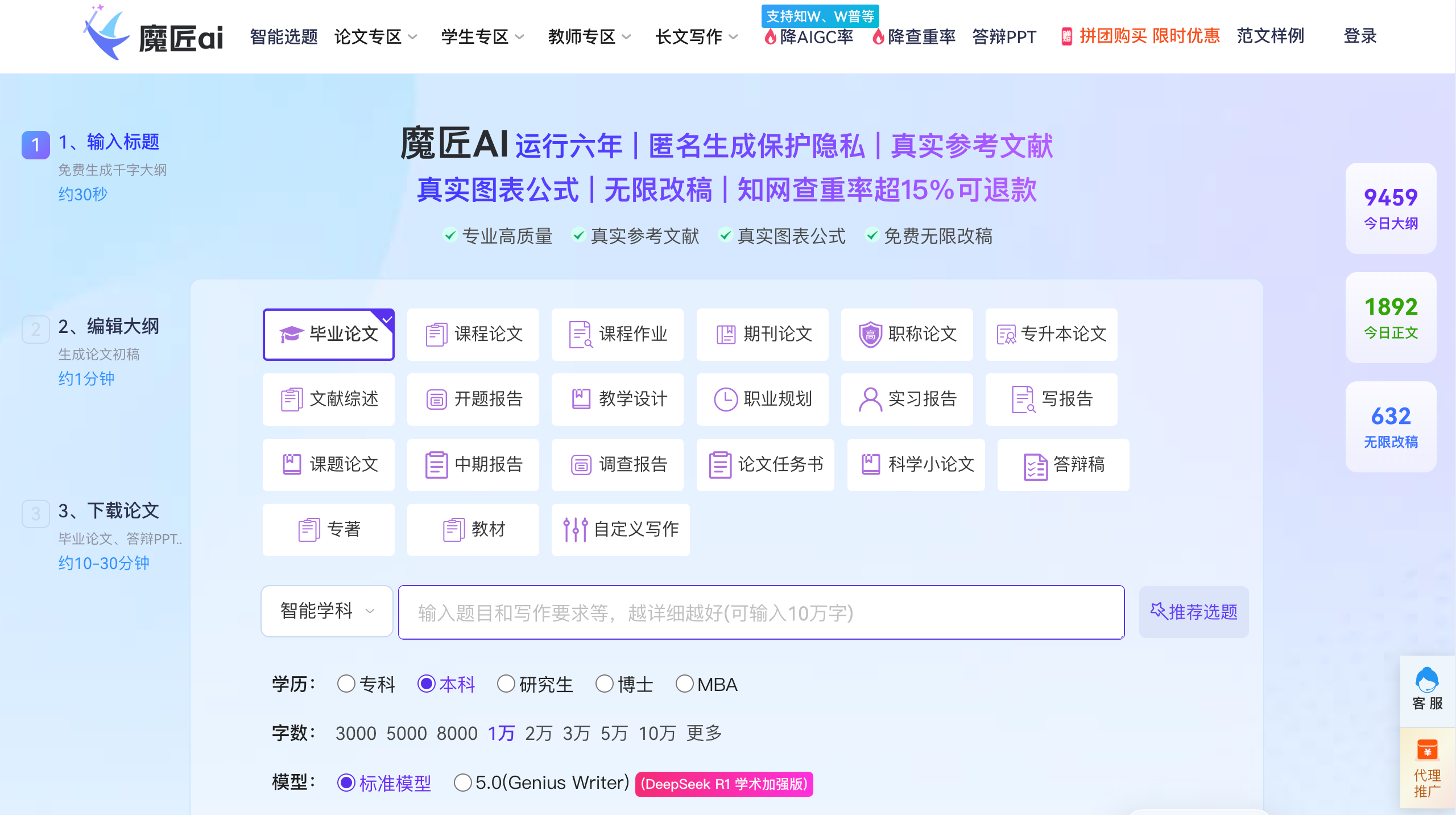 魔匠AI 是一个专注于学术论文AI智能写作与全流程辅助的平台,核心定位为专科、本科、硕士等不同学历阶段用户,提供从选题、大纲生成、正文撰写到参考文献匹配、查重降重的一站式论文解决方案,依托专业学术大模型,主打高质量、低查重、隐私保护等核心优势,已稳定运行六年。