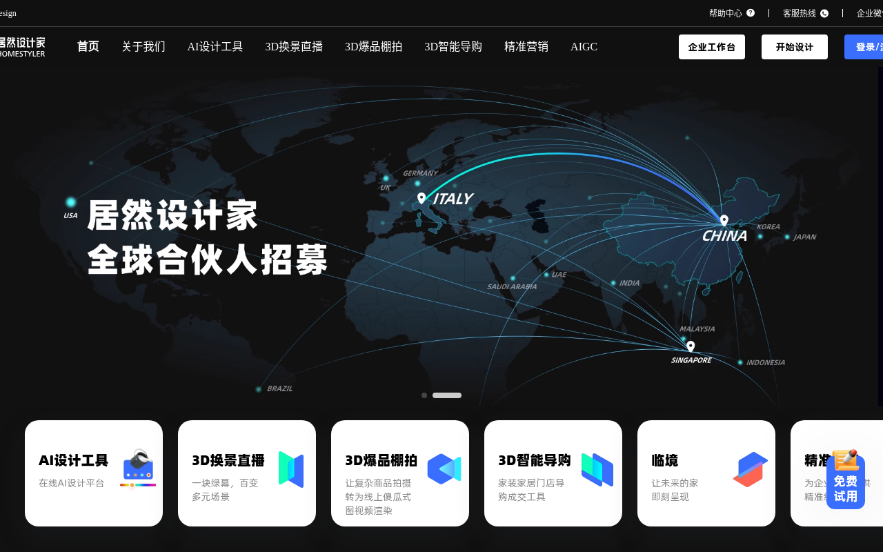 主要服务三类用户:需要高效工具的专业室内设计师、想自己设计或找灵感的普通业主,以及需要数字化营销(比如换景直播)的家居商家。平台以简体中文为主,国际版Homestyler则提供英文界面。