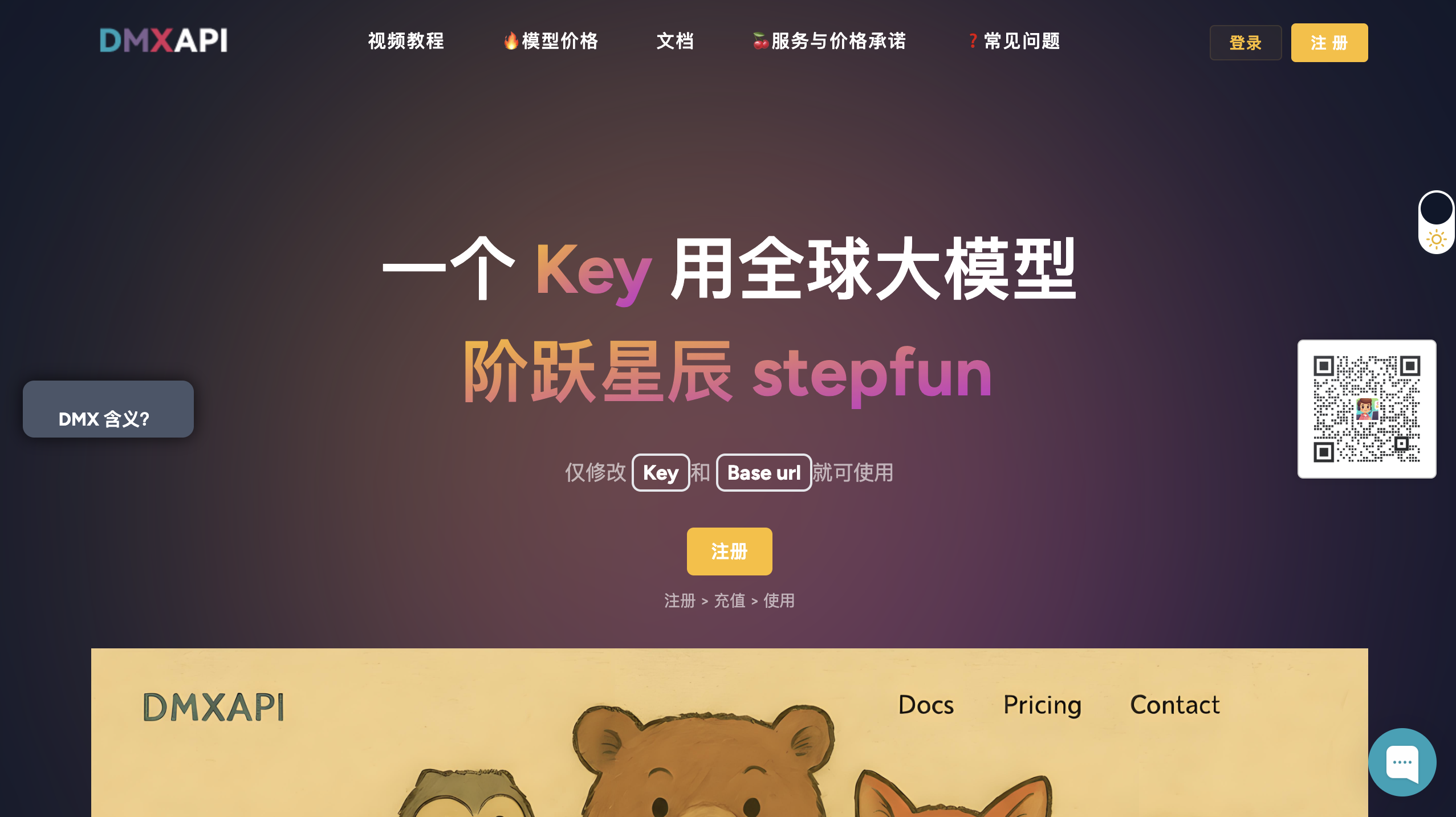 • 集成简单:修改 Key 和 Base URL 后,即可调用;提供代码示例(/models.html#code-block)和视频教程(DMXAPI-jiaocheng.mp4)指导集成。