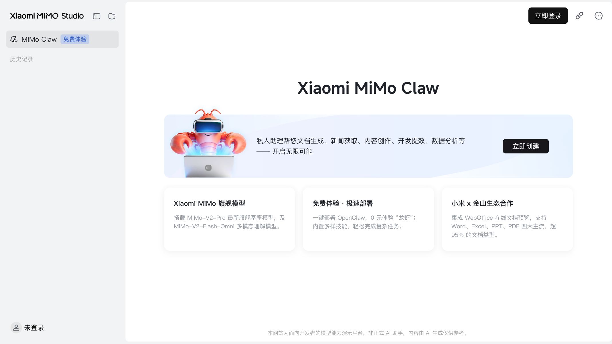 1. 限时免费:2026年3月19日起,MiMo Studio中的MiMo Claw全功能限时一周免费体验,一键部署OpenClaw龙虾智能体无任何费用,单次使用时长30分钟;