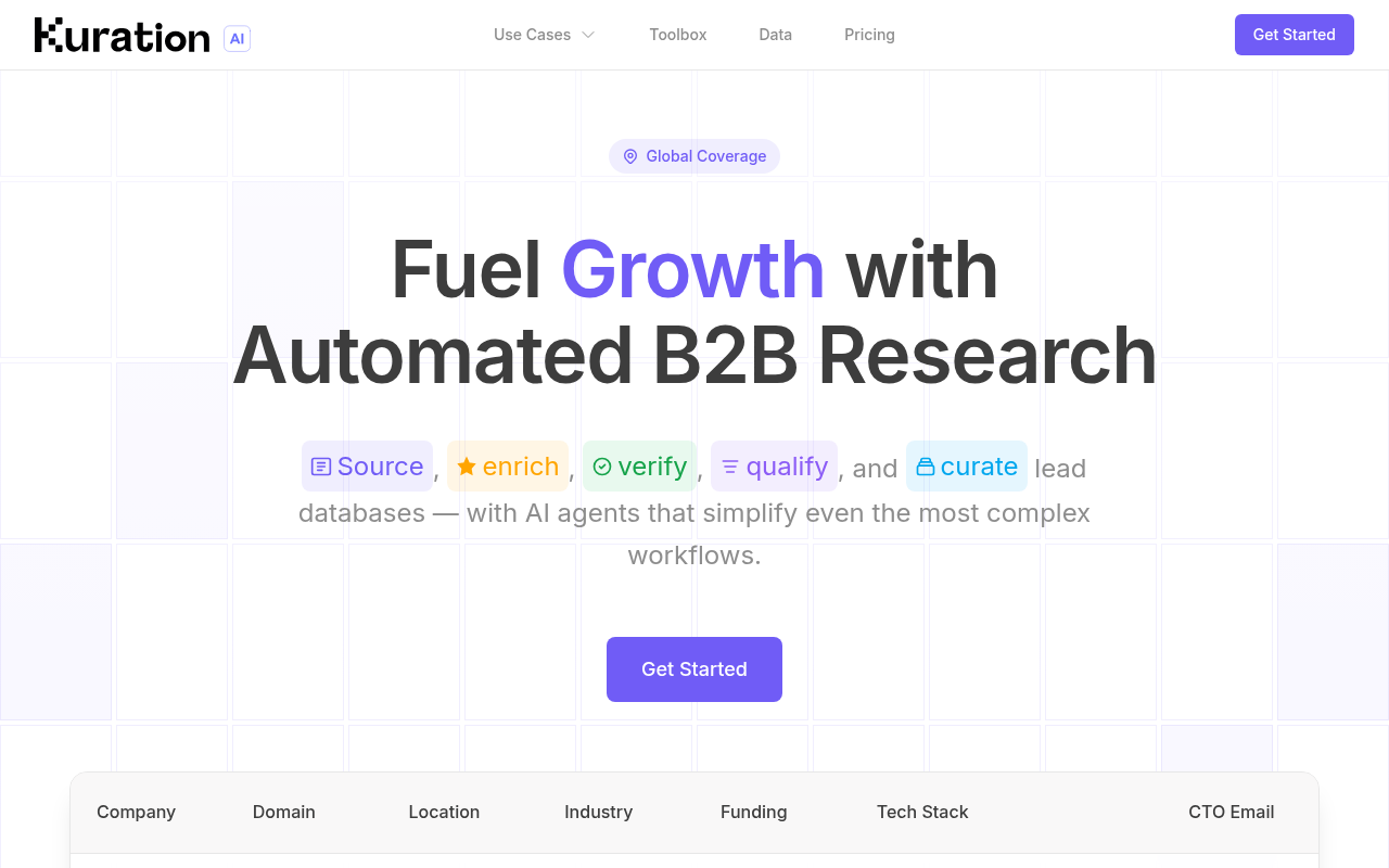 - 多源数据整合:Kuration AI 从数百个公开数据源(如网站、新闻、Google Maps、Pitchbook、Crunchbase、Apollo 等)收集 B2B 数据,覆盖全球范围。
