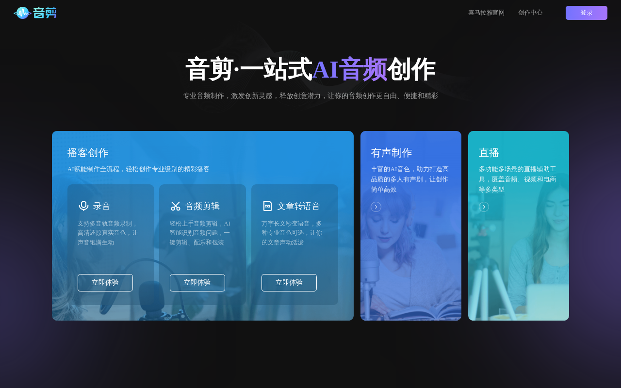 一个功能全面、操作简单的在线音频编辑平台,集录音、剪辑、混音、降噪和发布于一体,适合从新手到专业创作者的各种音频创作需求。依托喜马拉雅的庞大内容生态和用户基础,它不仅提供丰富的音效资源,还能无缝将作品推广至数百万听众。无论是制作播客、有声书还是短视频配音,音剪都是一个高效且易用的工具。