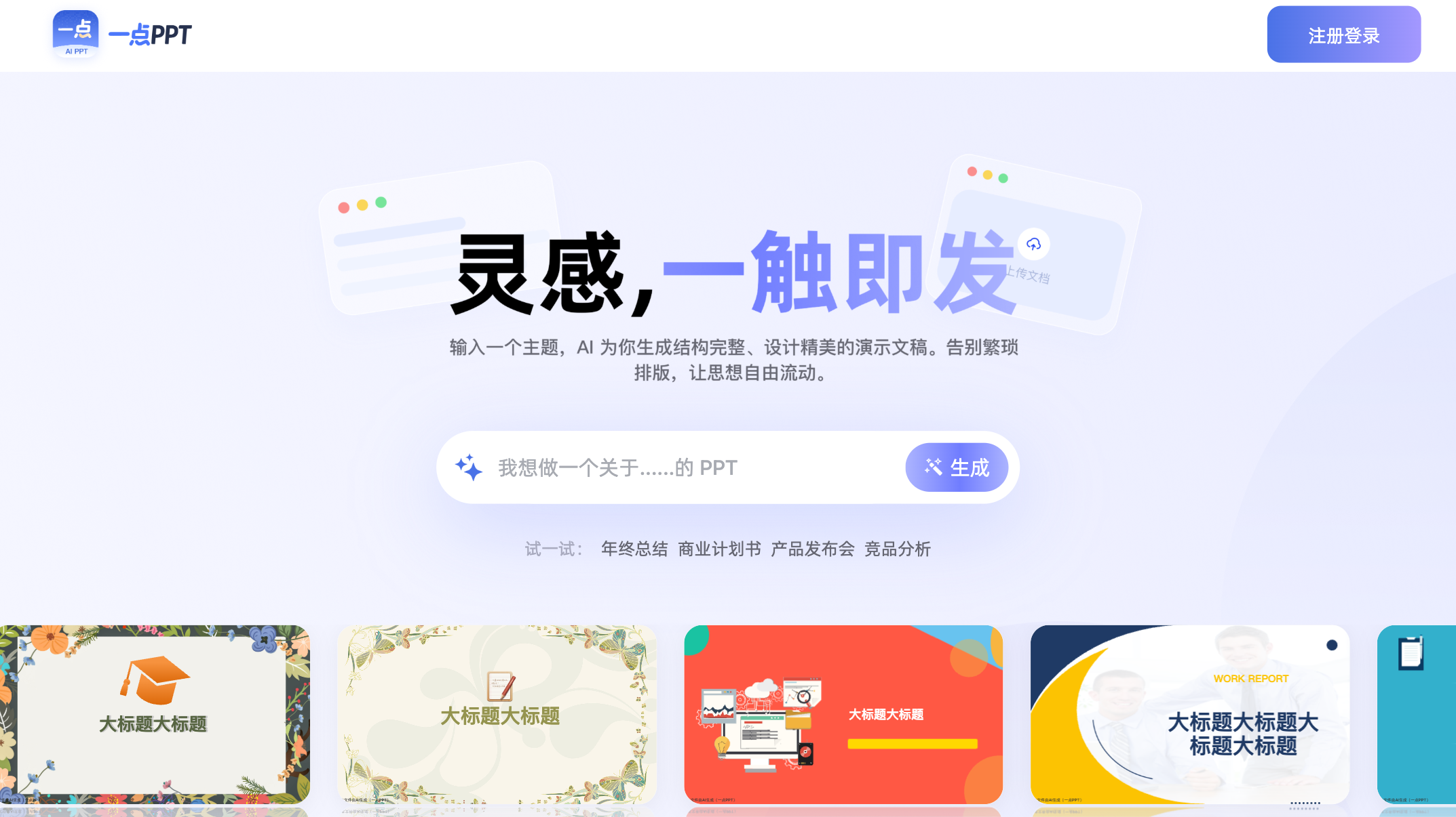 一点PPT 是一款AI驱动的智能演示文稿制作工具,深度融合大模型技术与专业设计体系,主打高效、智能、专业的PPT创作体验,解决传统PPT制作中内容梳理难、排版设计繁、耗时久的痛点,覆盖职场汇报、教学课件、毕业答辩、商业提案等全场景的演示文稿制作需求,无论是办公小白还是专业设计人员,都能借助其功能快速制作出高质感的PPT。