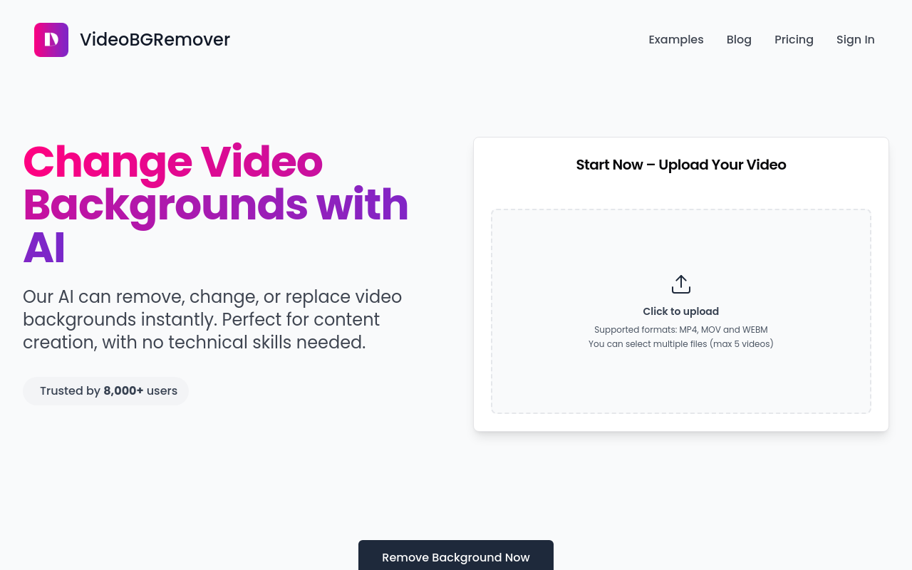 VideoBGRemover 是一个在线视频背景移除工具,利用AI技术自动识别并移除视频背景。无需绿幕或复杂软件,支持替换为透明、纯色或自定义图片背景,输出高清MP4、MOV或WebM格式。适合内容创作者、电商卖家、教育工作者快速处理视频。
