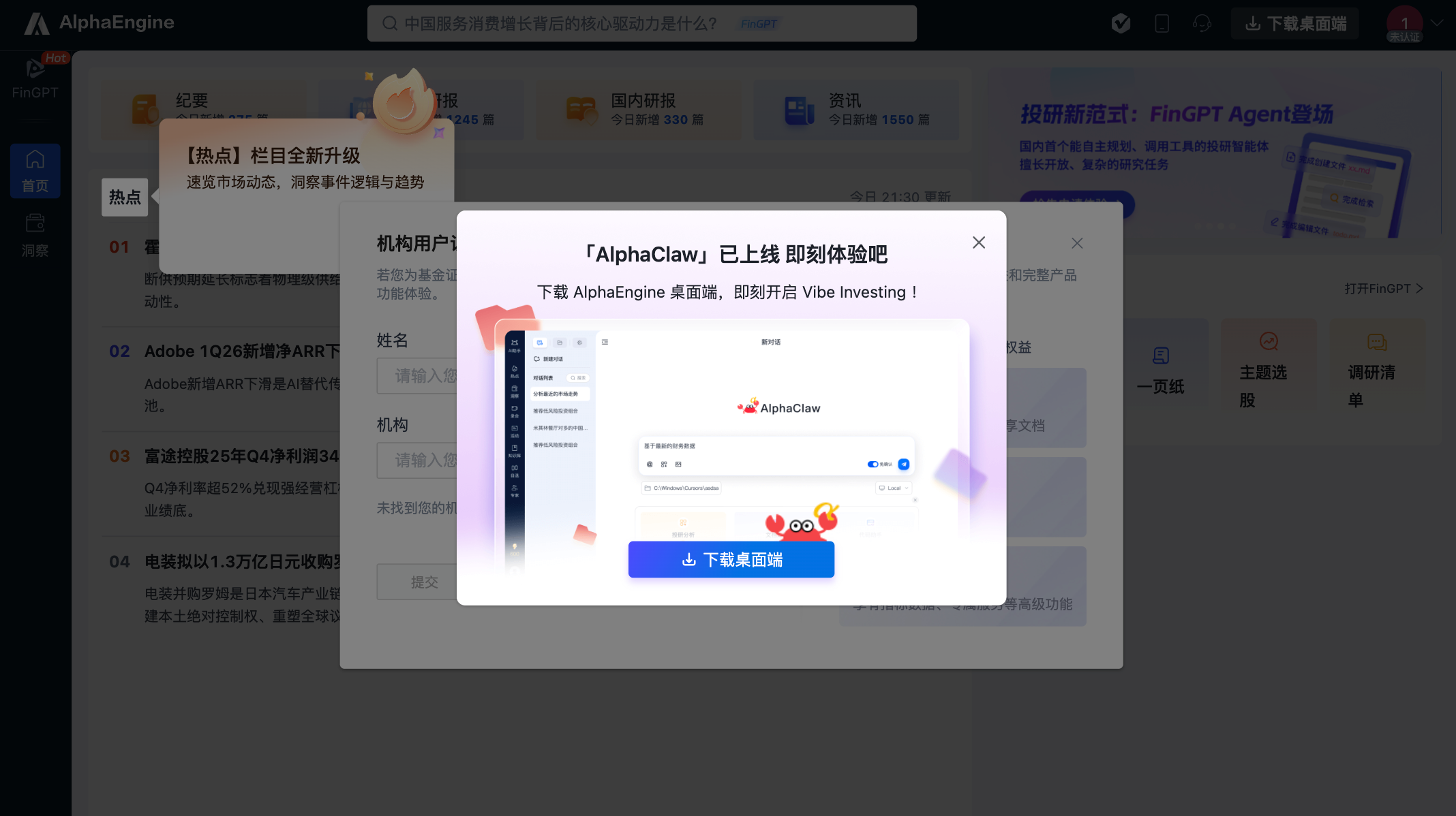 2. 使用载体:核心功能(如AlphaClaw、FinGPT Agent)需通过桌面端使用,网站可进行登录验证和桌面端下载,暂不支持纯网页端操作;