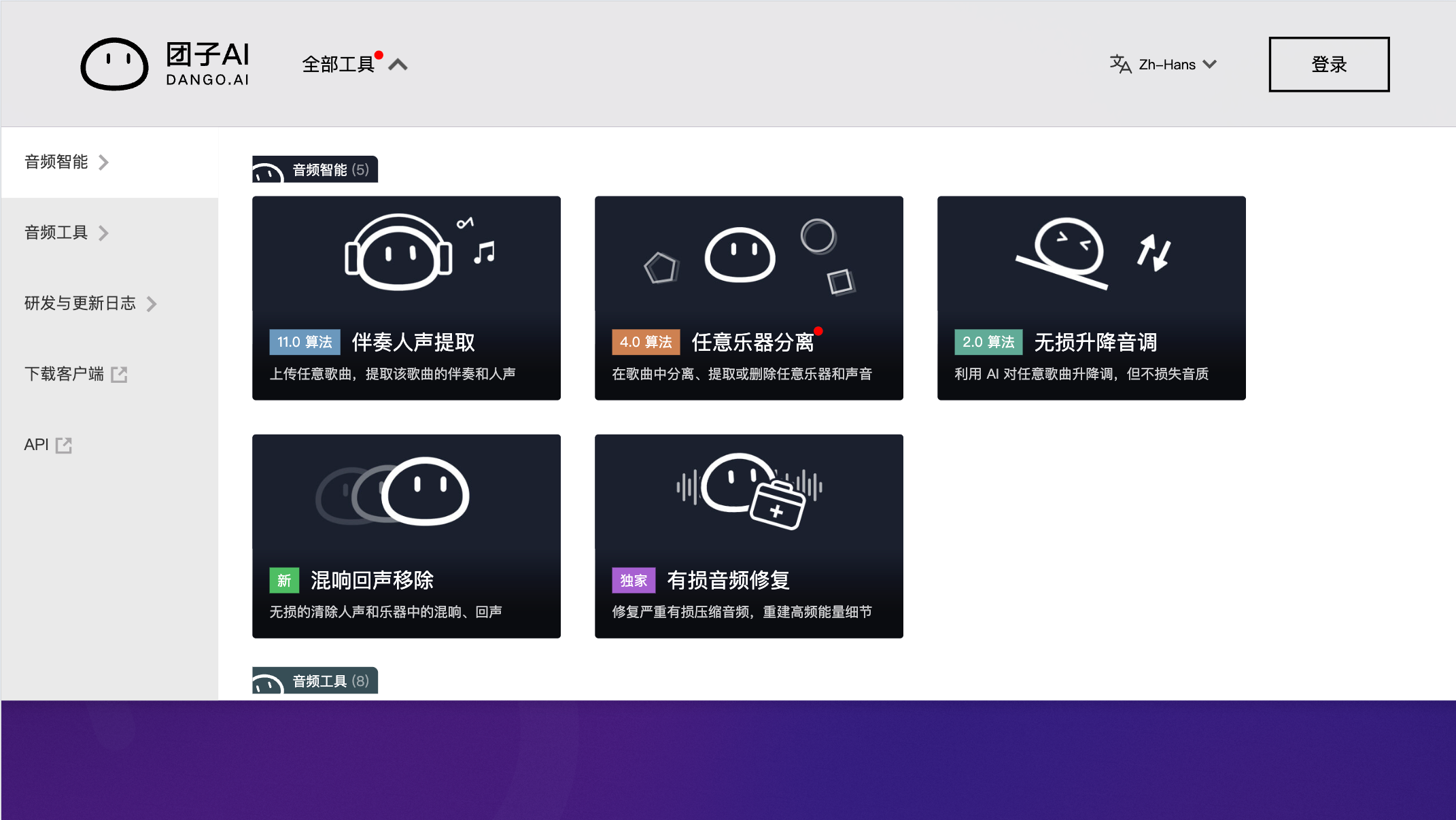 团子AI ** 是专注音频AI处理的在线工具箱**,主打音质优先、云端算力、零门槛、按量付费,面向音乐制作、翻唱、配音、音频修复、教育等场景,提供13项专业级AI音频能力,核心优势是分离干净、修复自然、无损处理。