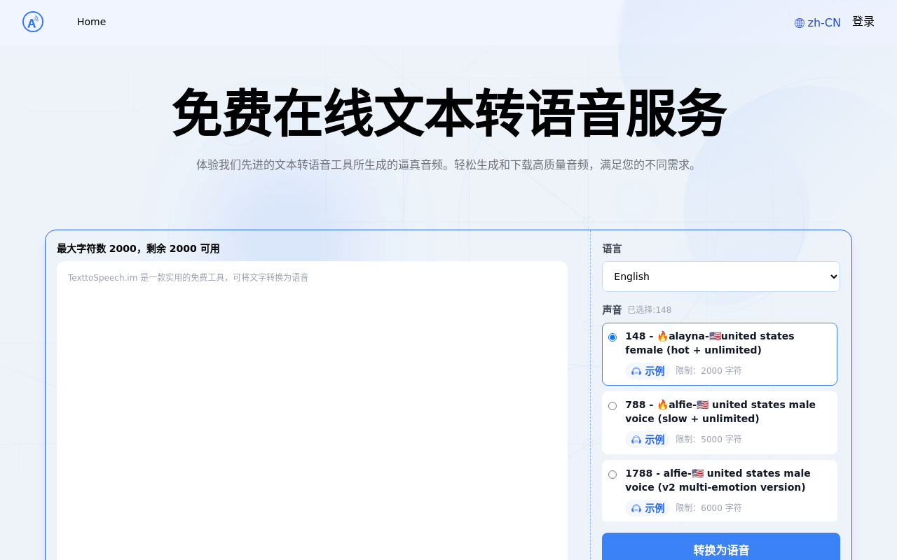 Text to Speech.im 是一个在线免费文本转语音(Text-to-Speech, TTS)工具,旨在将用户输入的文本转换为自然流畅的语音输出。该网站利用先进的AI技术生成高质量、逼真的音频,适用于多种场景,如内容创作、 accessibility 支持、教育、广告、有声读物等。