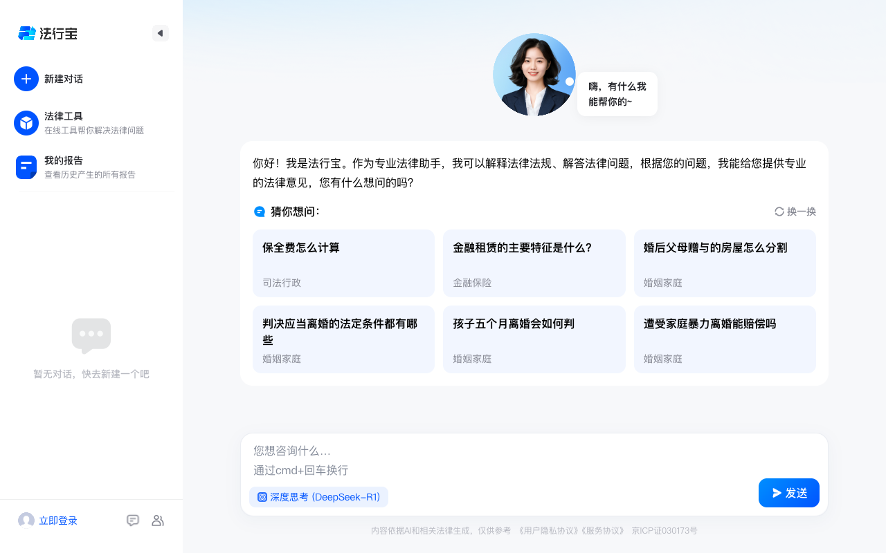 你有法律问题,比如工作上闹矛盾、合同扯皮或者家里有事,可以直接用文字或语音问它。AI会结合法律法规和案例,给你一个初步的解答。像租房纠纷、要债、知识产权保护这些常见场景,它都能聊。