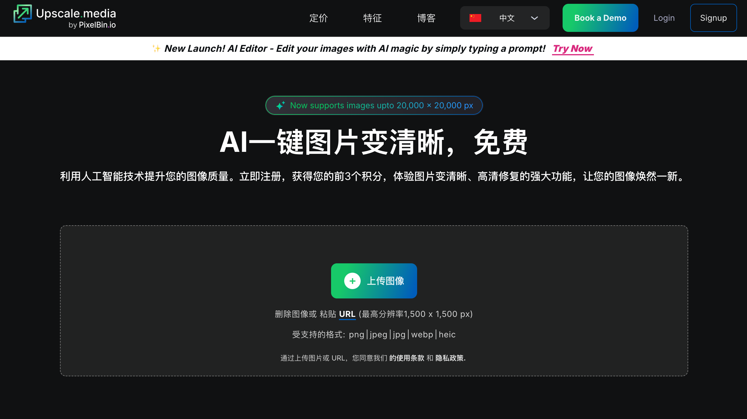 1. 访问网站:打开 https://www.upscale.media/zh,同意使用条款和隐私政策。