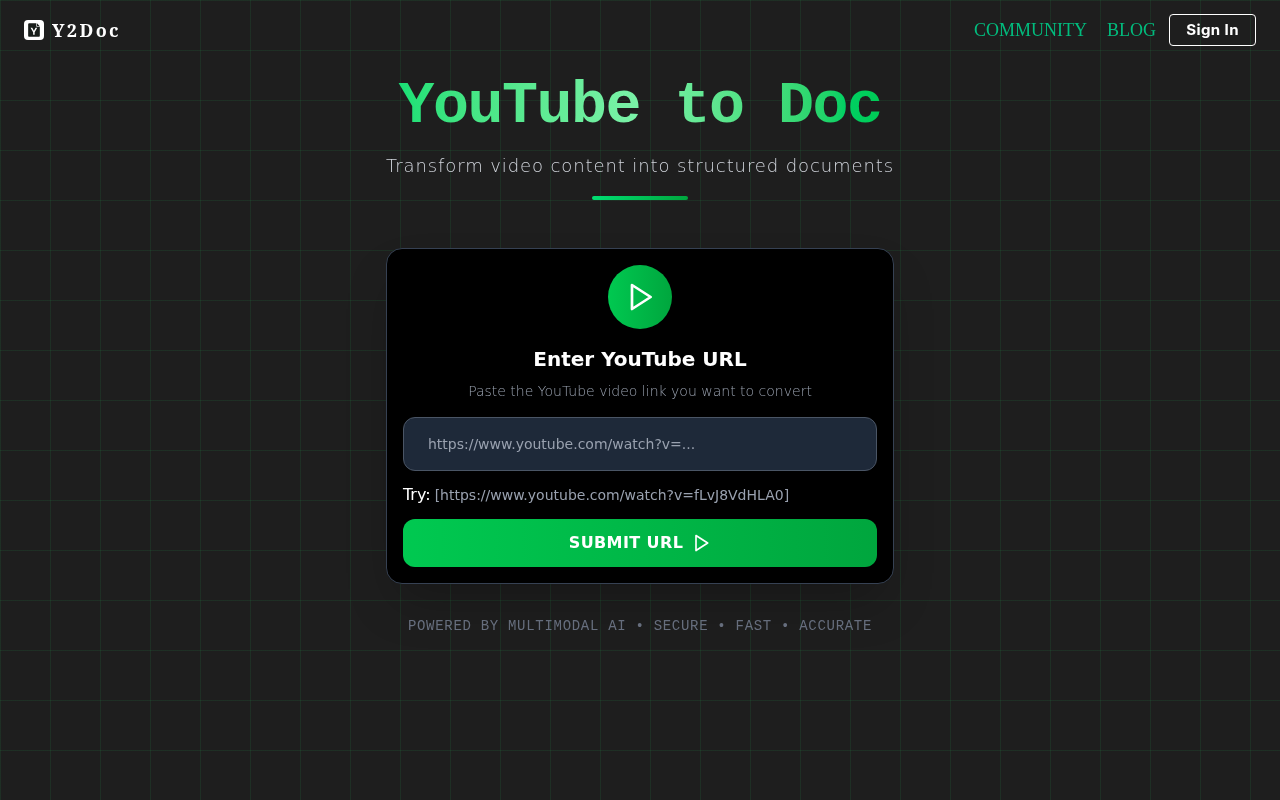 y2doc.com 是一个专注于将 YouTube 视频内容转换为结构化文档的在线平台。