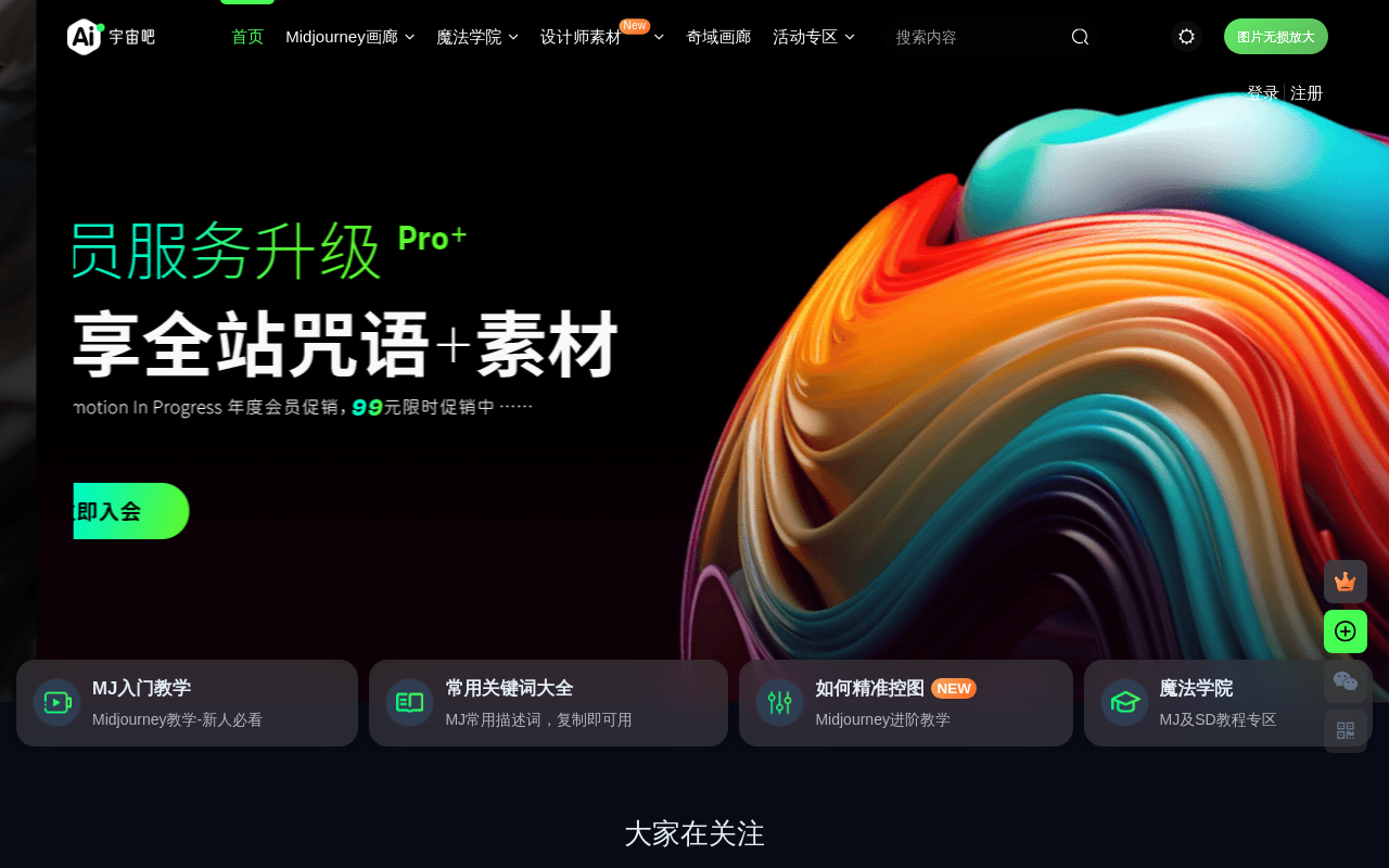 AI宇宙吧(https://www.aiyuzhou8.com)是一个专注于 AI 绘图(特别是 MidJourney 关键词)的社区平台,提供关键词分享、图片无损放大、优质设计素材等功能。网站通过会员制和社区互动机制,为用户提供多样化的创意资源,适合设计师、艺术家或 AI 绘图爱好者使用。部分功能需付费解锁,会员服务强调海外设计潮流和高质量素材,适合追求专业化设计输出的用户。
