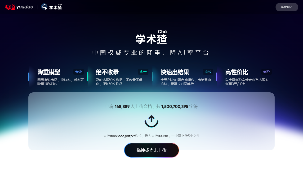 学术猹(xueshucha.youdao.com)是网易有道推出的一个网站,专门帮人处理论文的重复率和AI生成痕迹问题。