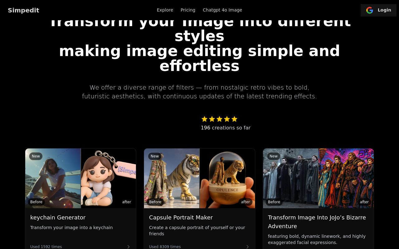 Simpedit是一个在线图像编辑平台,专注于通过人工智能技术提供一键式图像风格转换工具。用户只需上传图片,即可应用多种艺术滤镜和特效,将普通照片转变为具有复古、赛博朋克、像素艺术或其他流行风格的独特作品。