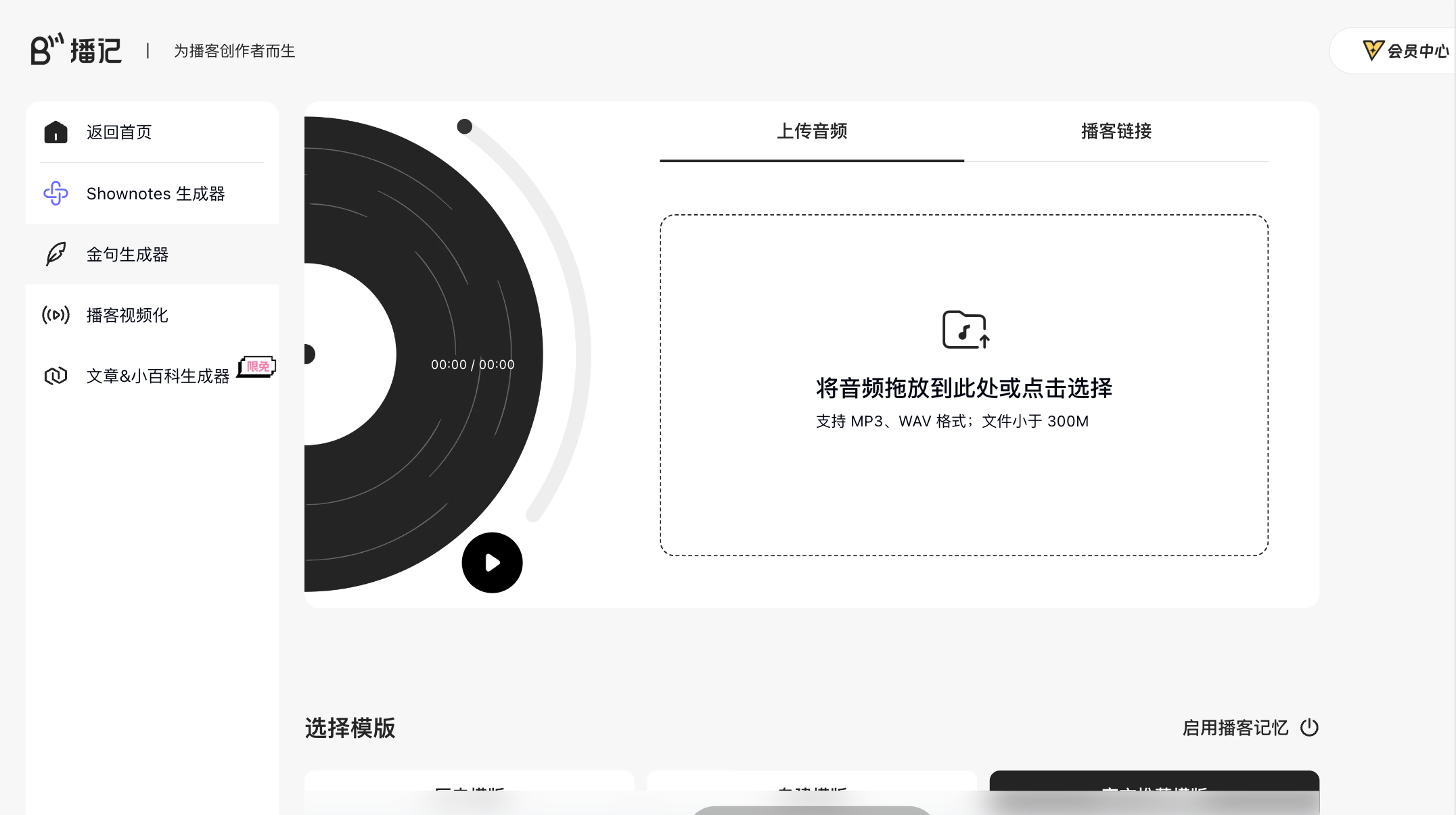 • 音频上传与链接支持:支持将音频拖放至指定区域或点击选择,支持 MP3、WAV 格式,文件大小限制小于 300M;另可通过播客链接直接处理。
