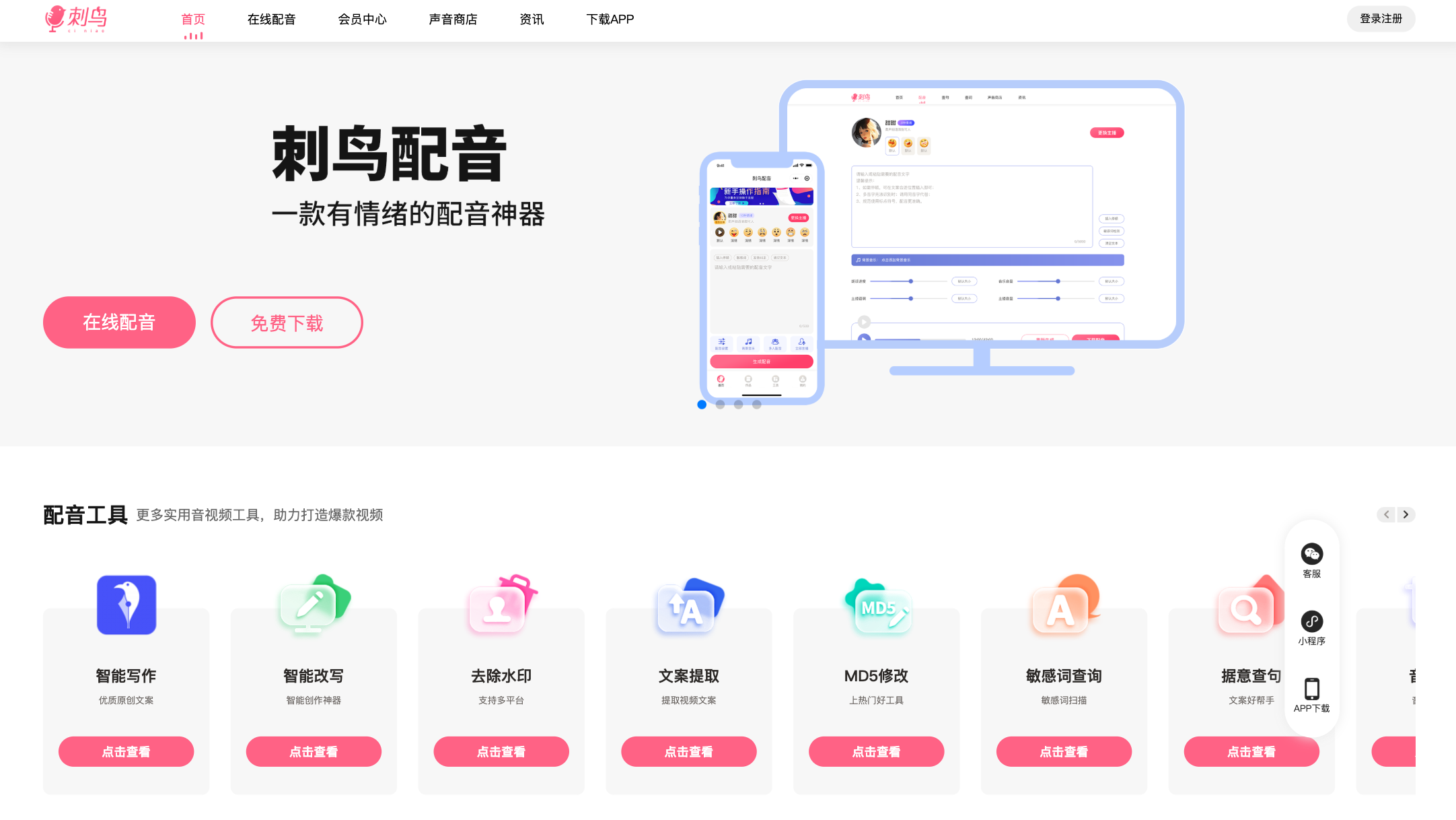 刺鸟配音官网整合了多种工具,覆盖音频视频处理的各个环节。每个工具都提供“点击查看”选项,用户可进一步探索详情。以下是其主要功能的详细介绍: