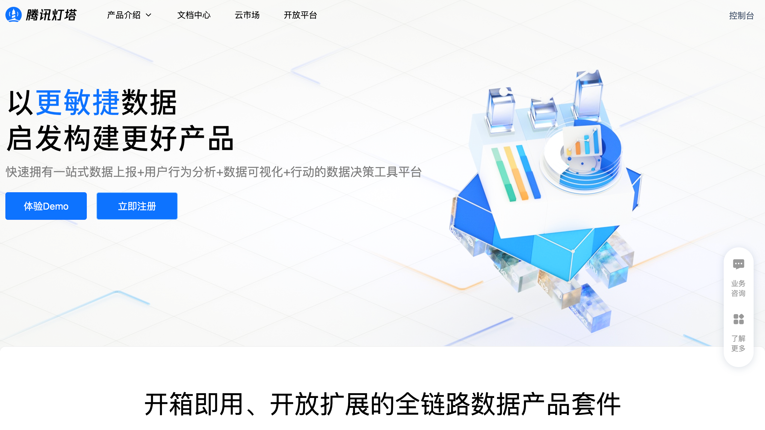 腾讯灯塔(beacon.qq.com)是腾讯推出的全场景数据决策工具平台,核心定位是为企业提供“数据上报+用户行为分析+数据可视化+行动落地”的一站式解决方案,帮助产品、研发、销售、管理等团队通过敏捷数据洞察快速决策,提升用户服务质量与经营稳健性。平台经过多行业海量数据验证,兼具开箱即用的便捷性与开放扩展的灵活性。