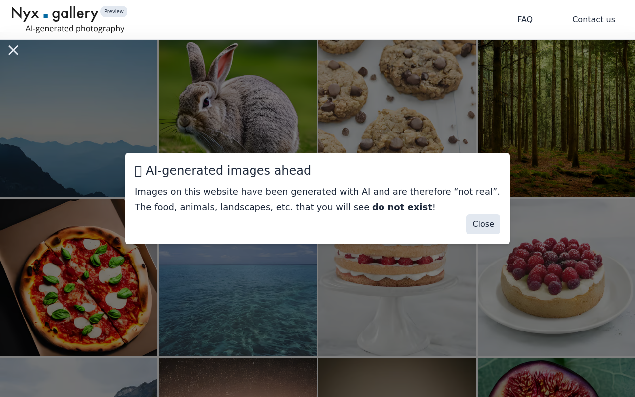 Nyx.gallery 是一个专注于人工智能生成摄影的在线平台,主要用于展示和提供AI生成的图像内容。它由NyxAI公司开发,成立于2022年,总部位于美国新泽西州普林斯顿。该网站的核心理念是通过AI技术生成逼真的摄影作品,这些图像涵盖了食物、动物、风景等多种主题,但所有内容均为“虚构”,即并非真实存在的物体或场景。以下是对其用途和功能的详细介绍: