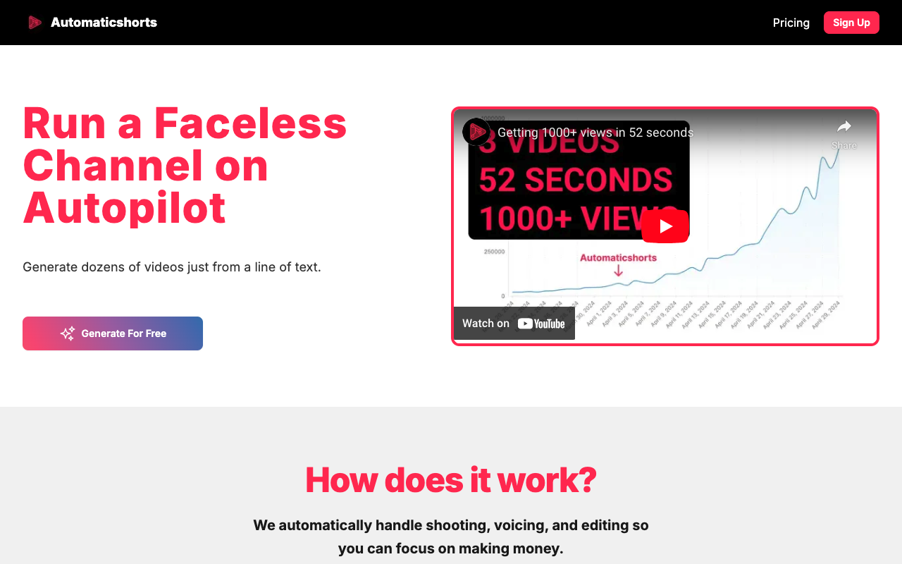 Automaticshorts 是一个AI驱动的视频自动化生成平台,专为创建和运营“无面孔频道”(faceless channels)而设计。它允许用户仅通过输入一行文本或选择主题,即可自动生成高质量视频,包括拍摄、配音和编辑全流程,从而实现频道全自动运行。平台强调被动收入模式,帮助用户专注于货币化(如赞助、联盟营销和广告收入),而非内容生产。网站界面简洁,支持英文操作,提供免费试用(1周),但核心功能需订阅付费计划(Starter $19/月起)。它使用生成式AI确保每个视频独特,避免重复,支持高清输出、无水印下载和跨平台使用。目前仅支持1个系列,NSFW内容有过滤,但平台不保证所有输出适合所有观众。