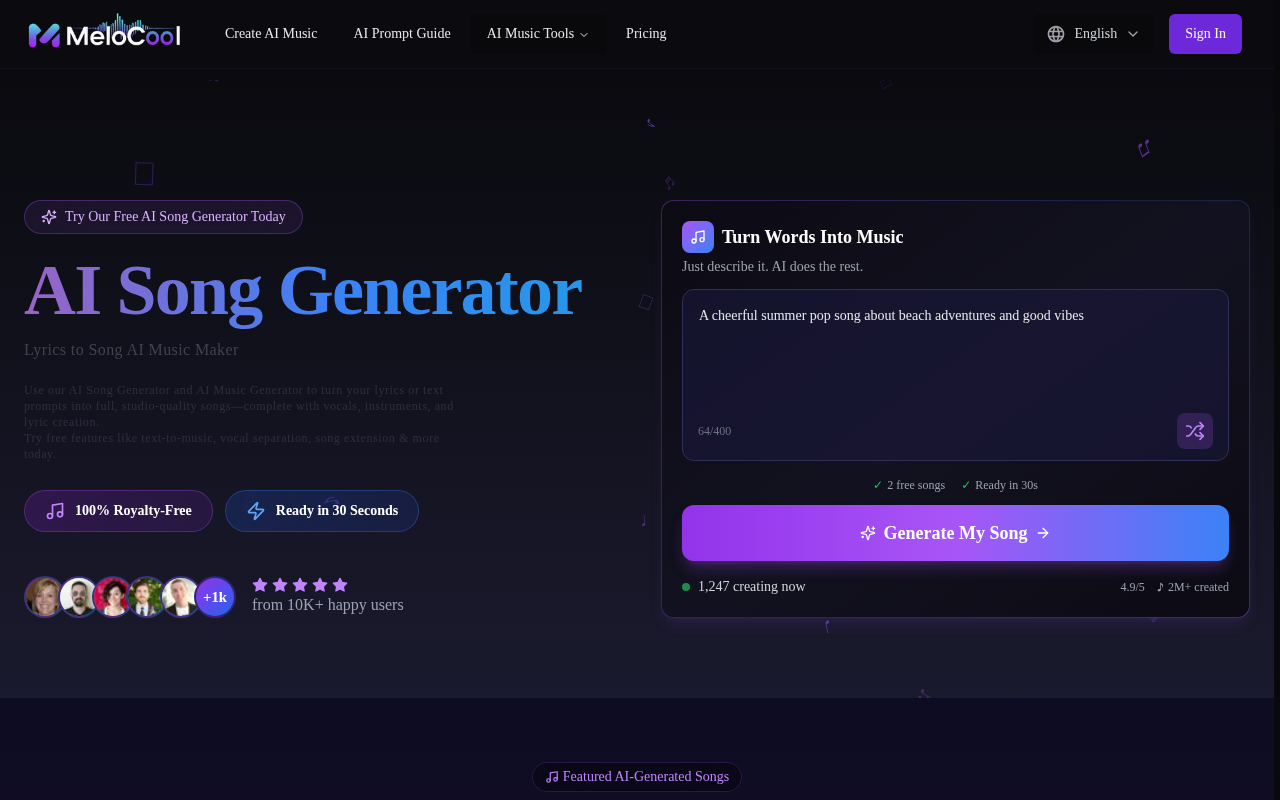 MeloCool 是一款基于 AI 技术的在线歌曲生成与音乐制作平台,核心功能是将用户的文本描述、歌词需求转化为完整的专业级歌曲,覆盖 vocals(人声)、乐器伴奏、歌词创作等全环节,无需专业音乐知识即可快速产出原创音乐。