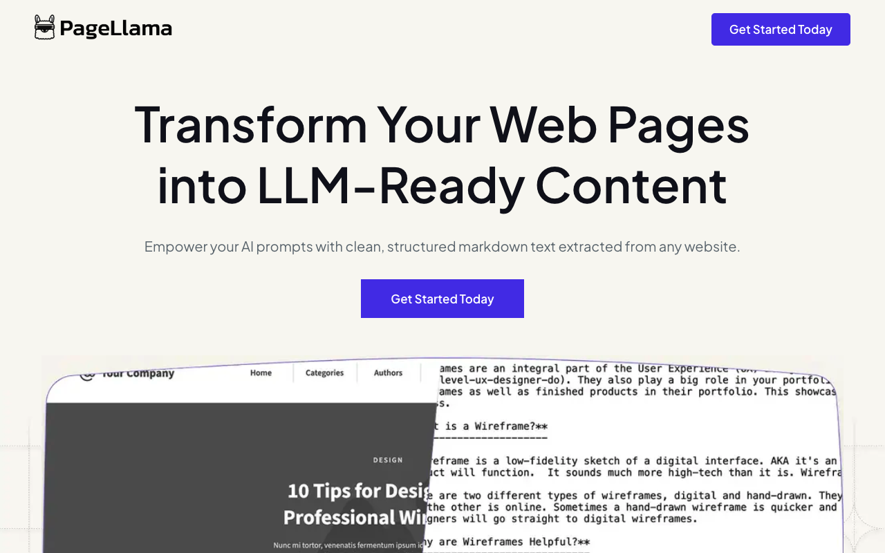• 用户只需输入网页的 URL,PageLlama 即可将复杂的网页内容快速转换为干净、结构化的 Markdown 文本。