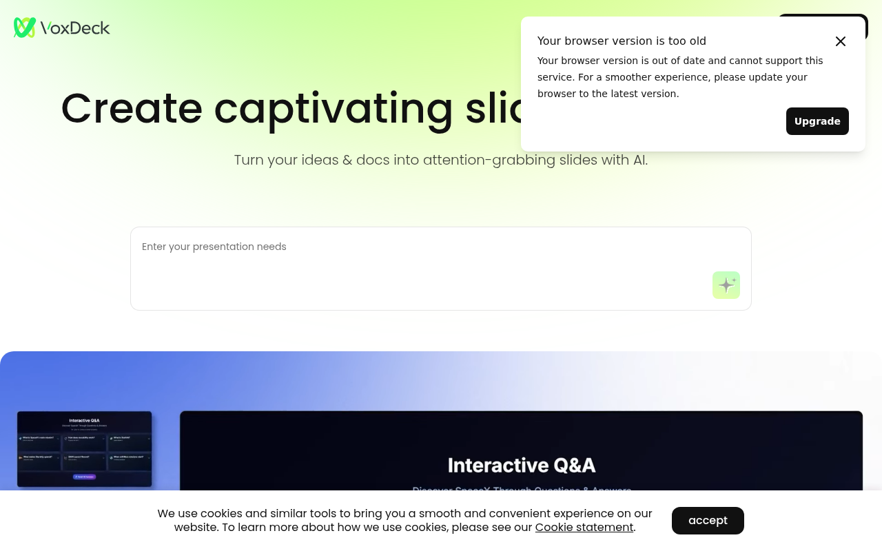 VoxDeck.ai 提供了一系列创新功能,结合 AI 和视觉设计,覆盖从内容生成到交付的全流程。以下是主要功能详述: