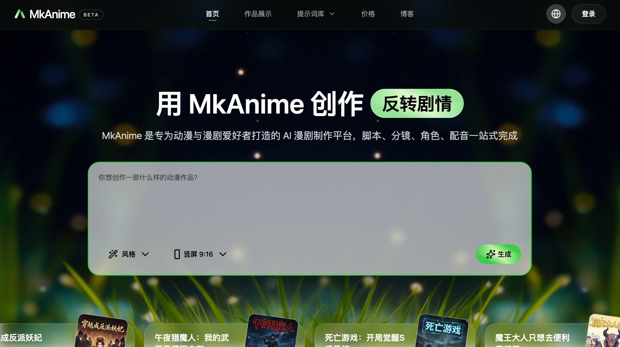 MkAnime 是一个零门槛的 AI 漫剧制作平台。你不需要会画画、剪辑或写剧本,只要有一个点子,输入一句话,它就能帮你把剩下的活儿全干了——从编故事、画分镜、设计角色,到配上声音,最后合成一个完整的视频。它的看家本领是让角色在不同镜头里长得一样,分镜可以按你的想法调整,并且做出来的视频天生就适合在手机竖屏上看,出片速度也很快。