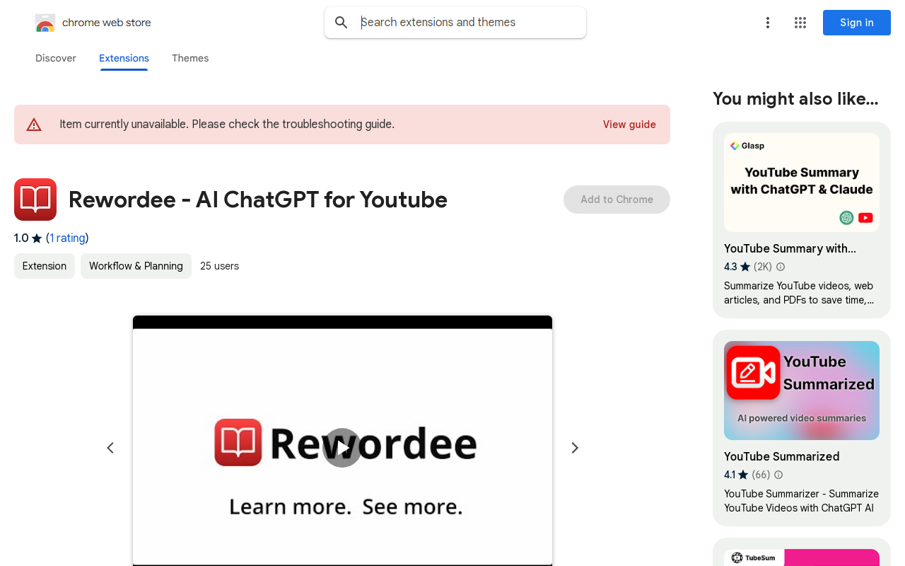 安装很简单,只需前往 Chrome 网上应用店,搜索“Rewordee”并添加到浏览器即可。它需要获取 YouTube 页面内容和相关文本数据的权限,目前仅支持 Chrome 及 Edge 等 Chromium 内核的浏览器。