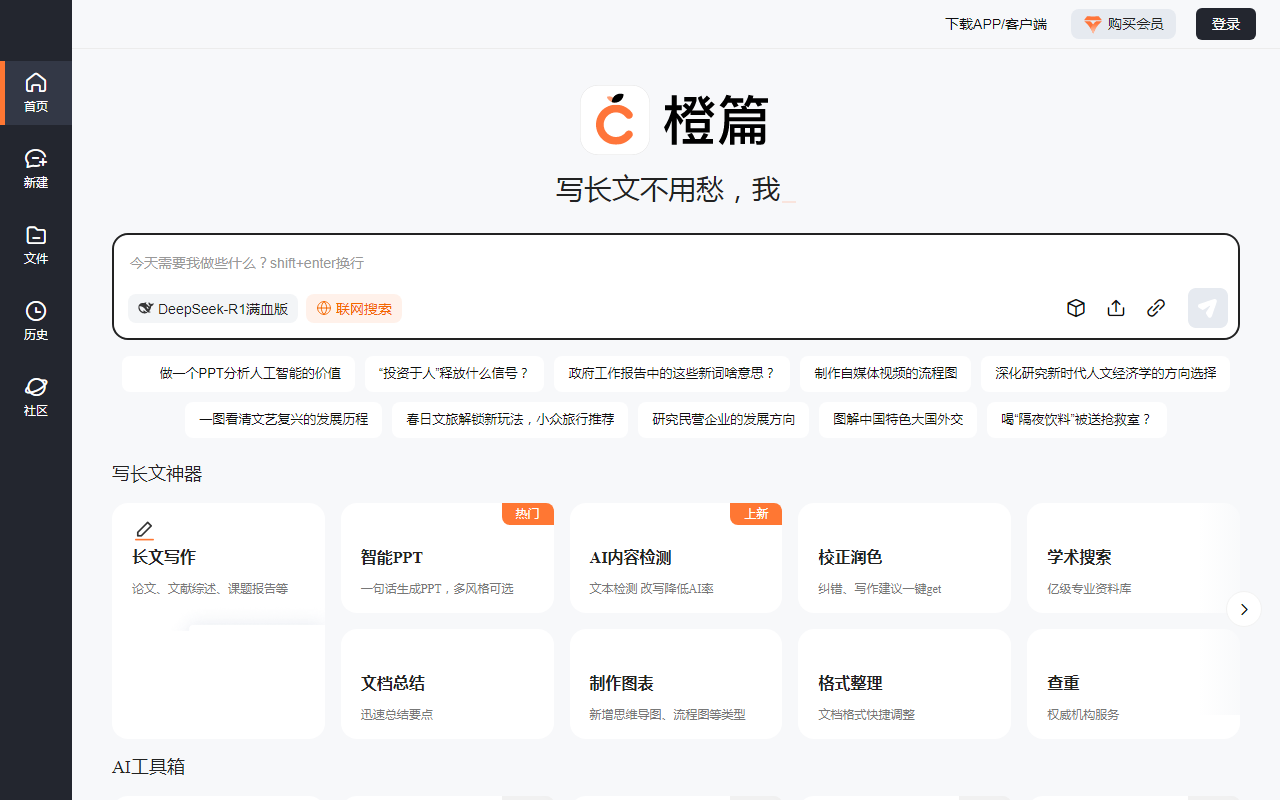 橙篇AI是百度推出的智能创作平台,基于ERNIE大模型技术,提供专业检索、长文生成、跨模态创作、内容优化、智能问答和数据分析六大核心功能。适用于营销文案、学术研究、媒体内容等多种场景,帮助用户高效完成内容创作与处理。