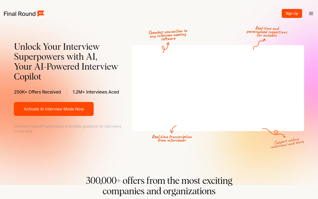 Final Round AI(官网:https://www.finalroundai.com)是一款用人工智能帮你准备面试的工具,从写简历到实际面试,它都能搭把手。