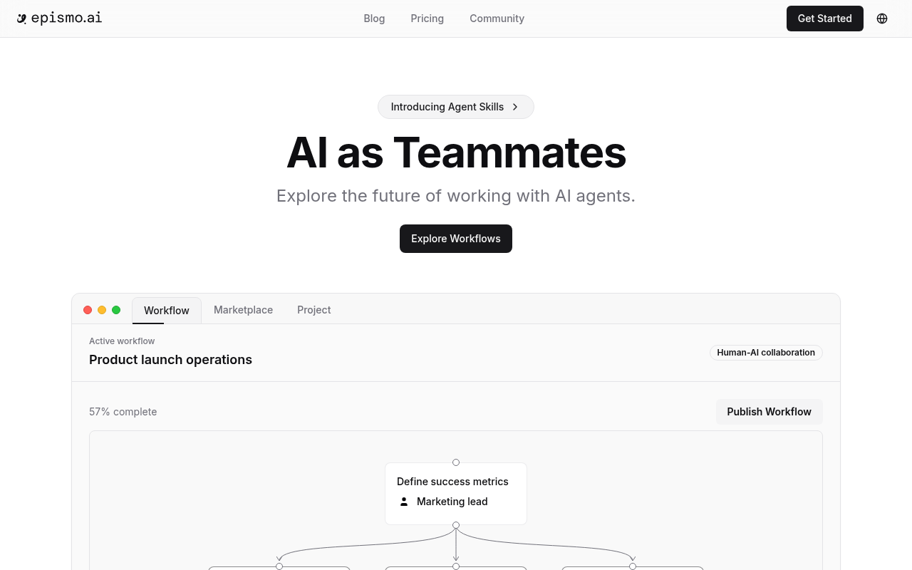 Epismo的核心想法很简单:别再把AI当成一个只会回答问题的工具了,把它变成一个能真正干活的“同事”。这个平台致力于构建一套人类与AI智能体的协作体系,通过标准化的、可复用的工作流,让AI能高效承接各类具体任务,从而实现更顺畅的人机协同工作模式。