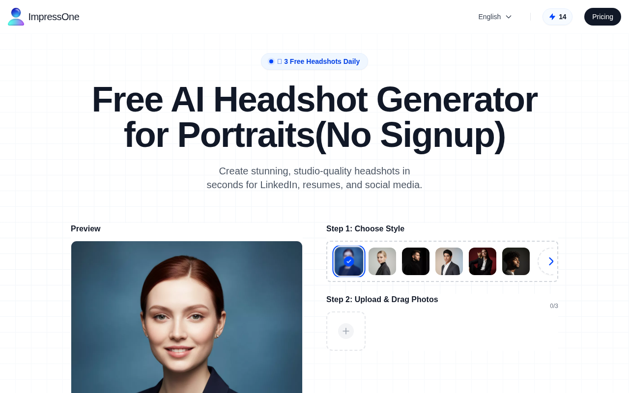 想拍张专业头像,但觉得影楼太贵、自拍又不够正式?试试 ImpressOne。这个工具完全免费,打开网页就能用,不用注册。你只需要上传一两张自拍,它就能在几秒钟内,给你变出一张看起来像在专业影棚里拍出来的职业照。