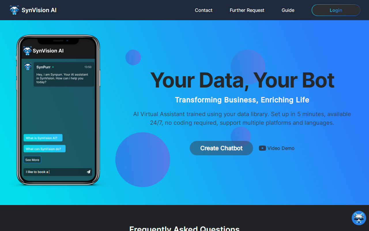SynVision AI 是一个面向企业和项目方的平台,它的核心是帮你打造专属的虚拟助手或AI聊天机器人。你不用从零开始教它说话,而是可以把自己的资料库——比如产品手册、客服问答、内部文档——交给它学习。这样一来,它回答的问题就更贴合你的业务,而不是泛泛而谈。