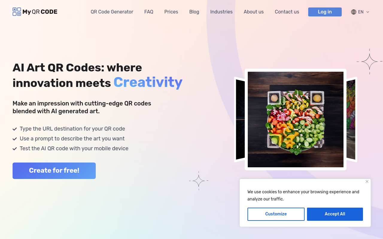 MyQRCode.com 是一个在线二维码生成平台,其子页面 https://myqrcode.com/ai-qr-code 专门提供基于人工智能的艺术二维码生成服务。这个工具旨在帮助用户把普通的链接变成既实用又好看的二维码。