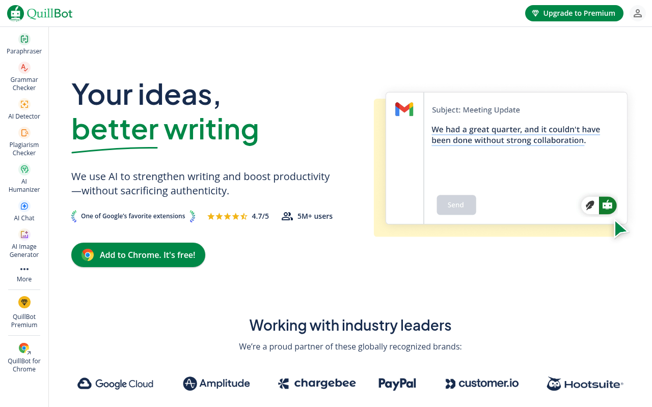 QuillBot是一个基于AI技术的写作辅助平台,它通过自然语言处理技术,为用户提供从改写优化到语法检查的一站式服务。这个工具不替代你的原创想法,而是帮你提升写作效率和质量。目前,它在全球拥有超过3500万用户,是Google浏览器扩展商店里评分很高的热门工具。