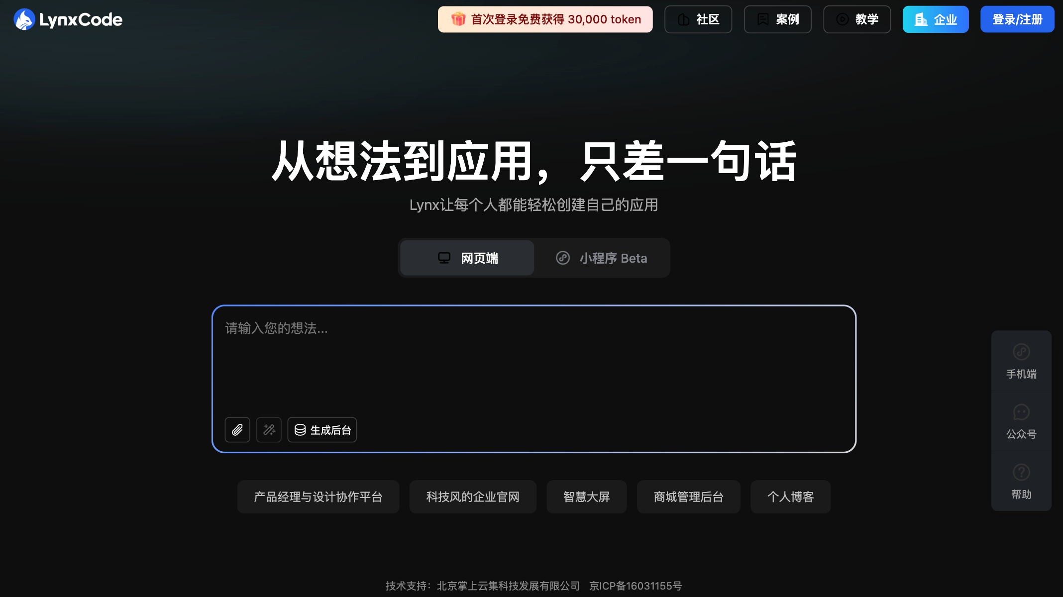 Lynx AI 是北京掌上云集科技发展有限公司推出的一款AI应用生成工具。它的核心是让你用说话的方式开发软件:无论你想做个官网、建个博客,还是搭个商城后台,只要把需求用中文描述出来,AI就能帮你把前后端代码和数据库都搞定。对编程一窍不通的新手,或者想提效的专业开发者,都能用得上。首次登录,平台还会送你30000个token,足够你体验几次“从想法到应用”的过程。
