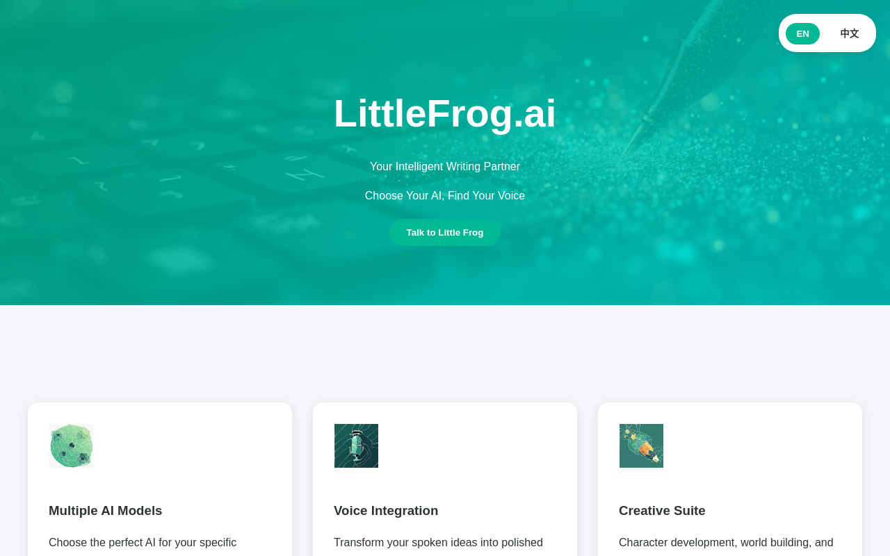 写作蛙(LittleFrog.ai)是智谱AI推出的免费智能写作工具,提供网页版和微信小程序。它能帮你生成文章、营销文案、报告、诗歌,支持标题创作、文本续写、风格仿写和智能问答。平台具备多语言支持和语音整合功能,适合学生、职场人士和自媒体用户提升写作效率。