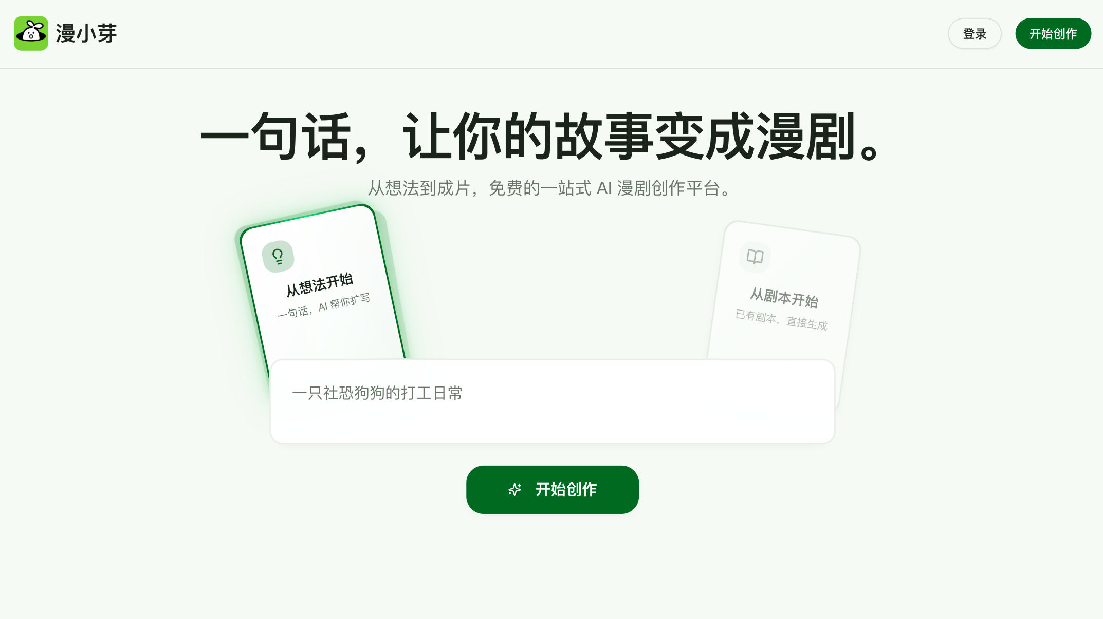 漫小芽是一个让普通人也能轻松创作漫剧的AI平台。无需绘画或剪辑经验,输入一句话或上传剧本,即可自动生成角色统一、带配音配乐的完整动画视频。平台整合Sora、Runway等先进模型,覆盖从创意到成片的全流程,适合个人兴趣创作或小型IP孵化。