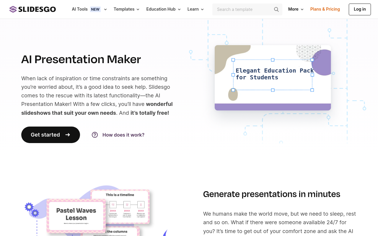 Slidesgo(官网:https://slidesgo.com/ai-presentations)是一个用AI帮你做PPT的在线平台。它的目标是让制作专业幻灯片这件事变得简单点,速度快一点。