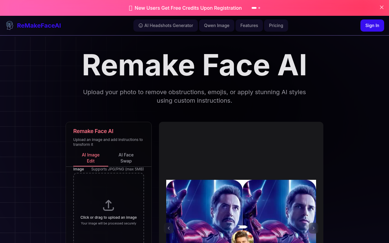 Remake Face AI(remakeface.ai)是一个功能多样的AI图像变换平台。它以面部替换和文字指令编辑为核心,提供了从基础美化到各种趣味主题的编辑工具,让普通人也能轻松玩转AI修图。
