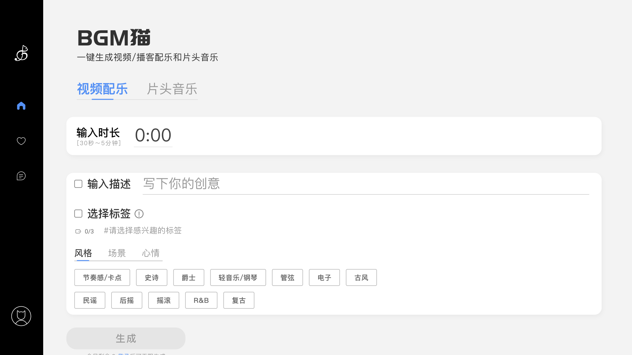 BGM猫的核心是智能音乐生成。操作很简单:你只需要告诉它视频的时长(比如30秒到5分钟),再选几个描述场景、风格(流行、电子、古典等)和心情(快乐、放松、紧张)的标签,AI就能为你“量身定做”一段背景音乐。