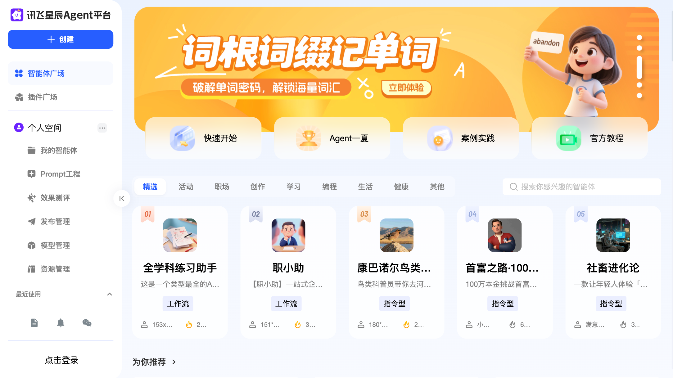 平台内置讯飞星火大模型及丰富的插件与MCP Server资源,支持一站式效果测评与迭代优化。开发者可灵活调用外部工具与知识库,实现智能体的个性化扩展。