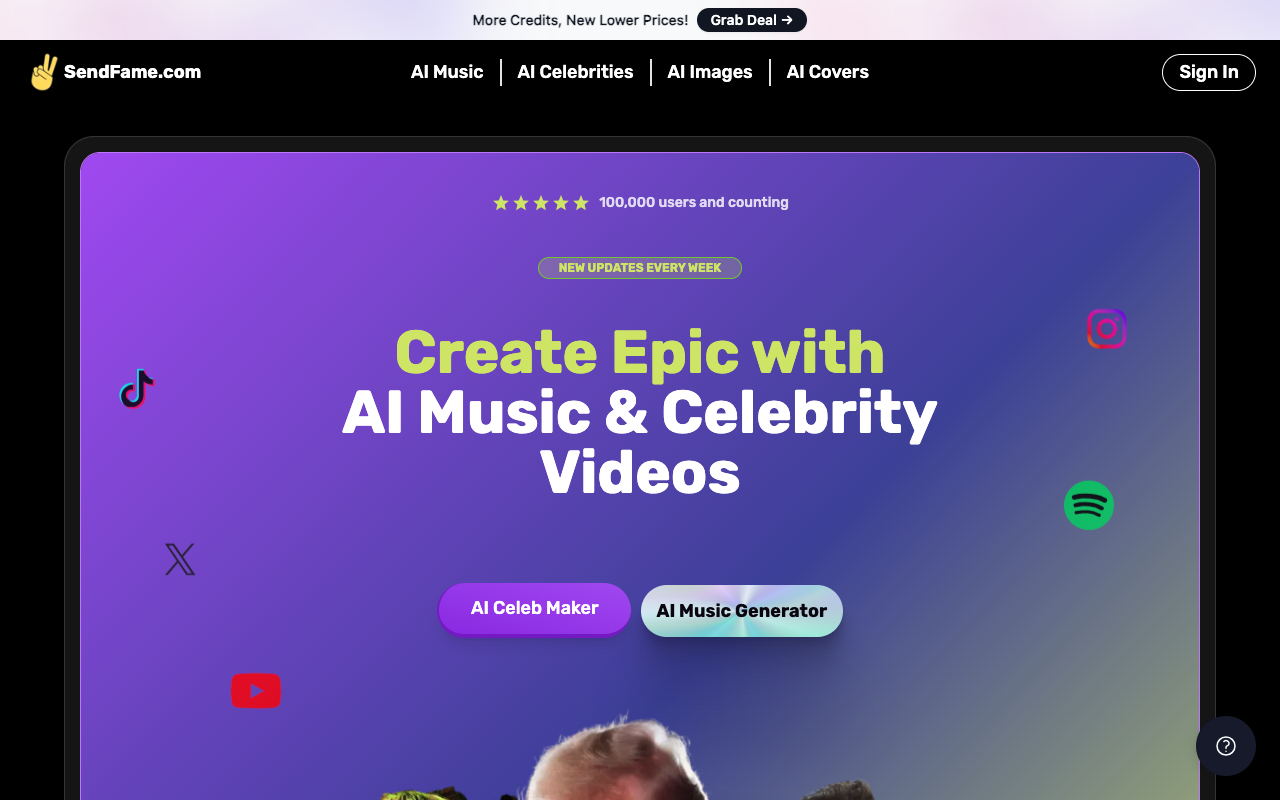 SendFame是一个集成了多种AI创作工具的平台。你可以用它生成AI名人祝福视频、创作免版税的音乐、将图片变成动态视频,或根据文字描述生成图像。操作简单,无需专业背景,适合个人娱乐和内容创作者快速产出创意素材。